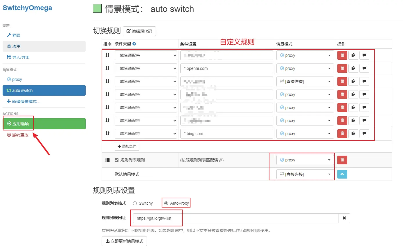 按图修改配置即可,规则列表网址:https://git.io/gfw-list
