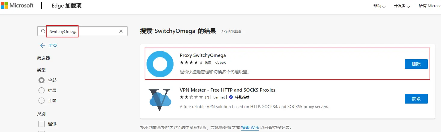 去浏览器的插件商店下载安装SwitchyOmega(这里以edge浏览器为例)