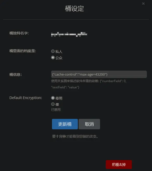 修改桶设定,桶信息:{“cache-control”:”max-age=43200”}