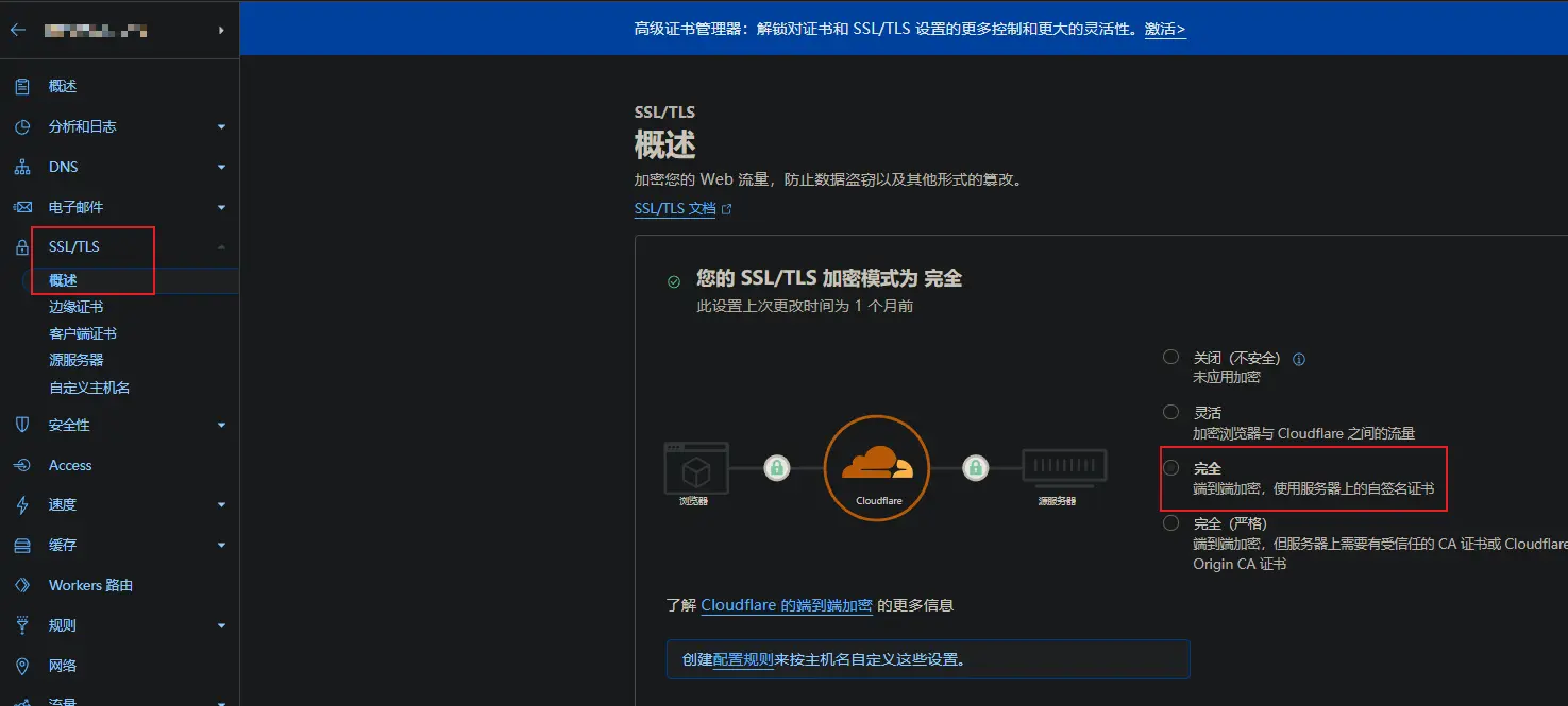 登录CF,添加CNAME的DNS记录,SSL/TLS修改为完全