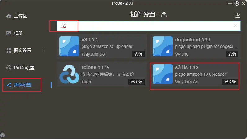 打开插件设置,搜索S3并安装