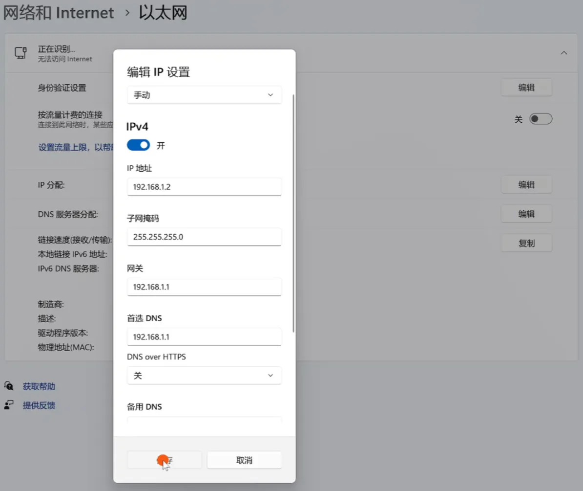 路由器断电后,先按住背后 Reset 恢复按钮不放,再插电,等待 10s 左右松开背后 Reset,路由器就进入了 uboot,电脑用网线连接路由器 LAN1,并设置好静态 IP:IP地址填 192.168.1.2,子网掩码 255.255.255.0,网关 192.168.1.1,DNS 192.168.1.1。