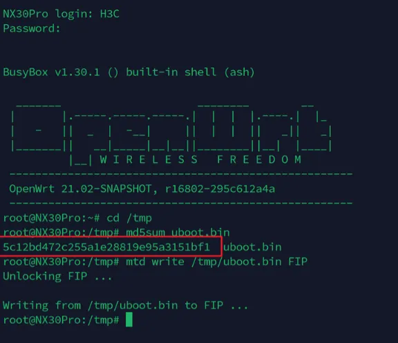 将下载好的uboot.bin文件复制到tmp路径下,并执行命令(请确保MD5 校验结果和图中相同,再敲回车执行)