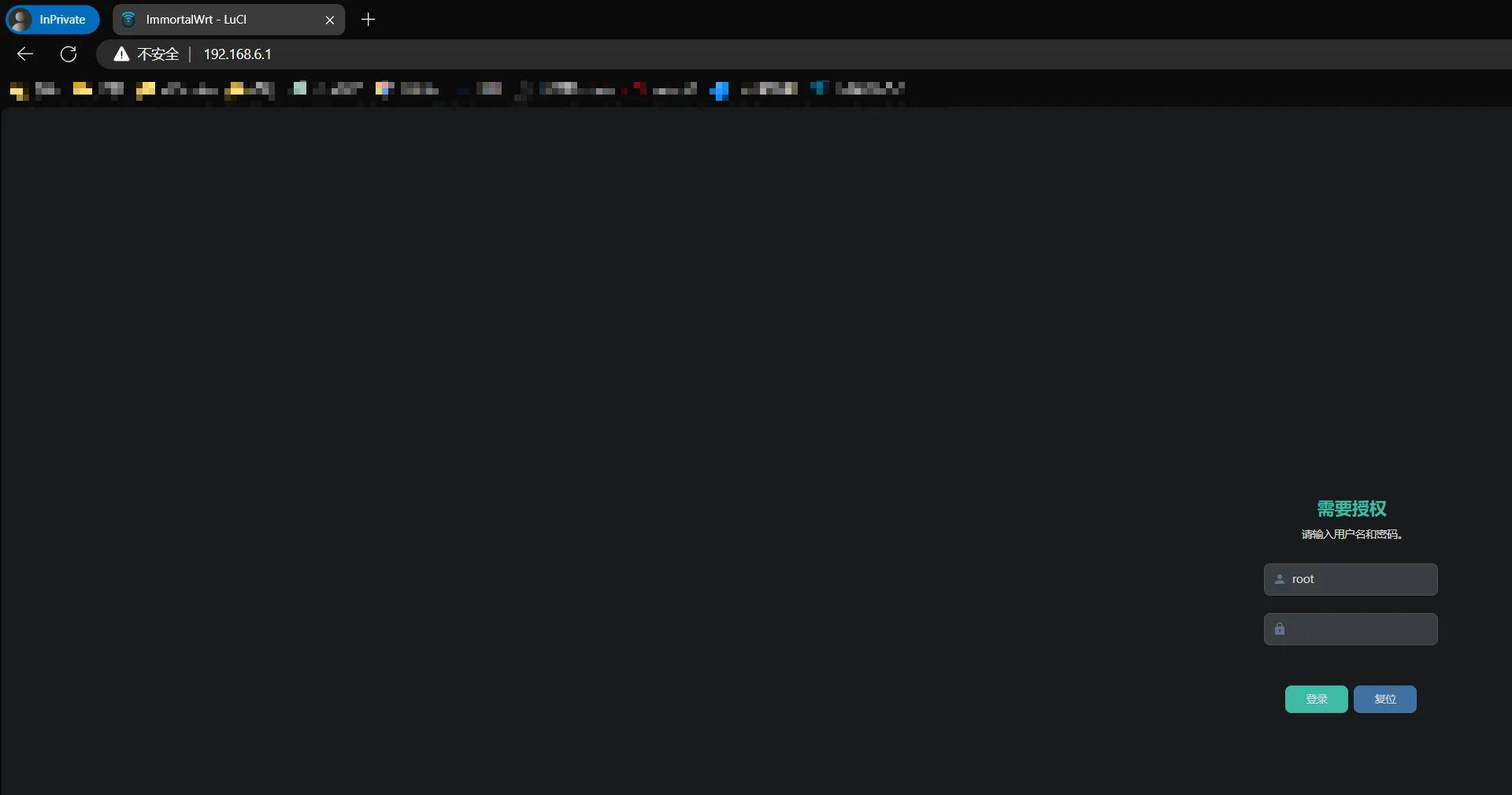 更新完成后系统会重启进入ImmortalWrt的系统,默认的WiFi是MTK开头没有密码,后台地址 192.168.6.1,用户名:root,密码:password