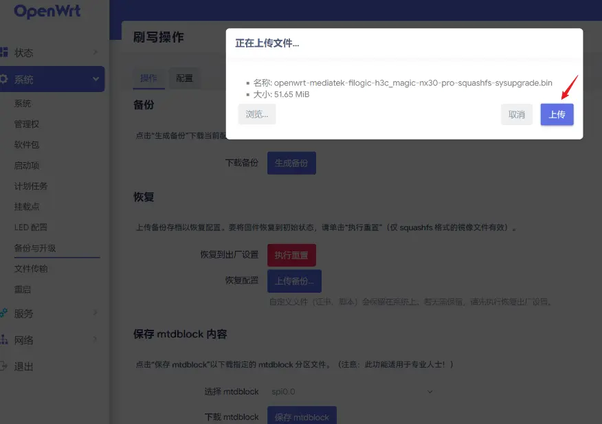 升级包:openwrt-mediatek-filogic-h3c_magic-nx30-pro-squashfs-sysupgrade.bin