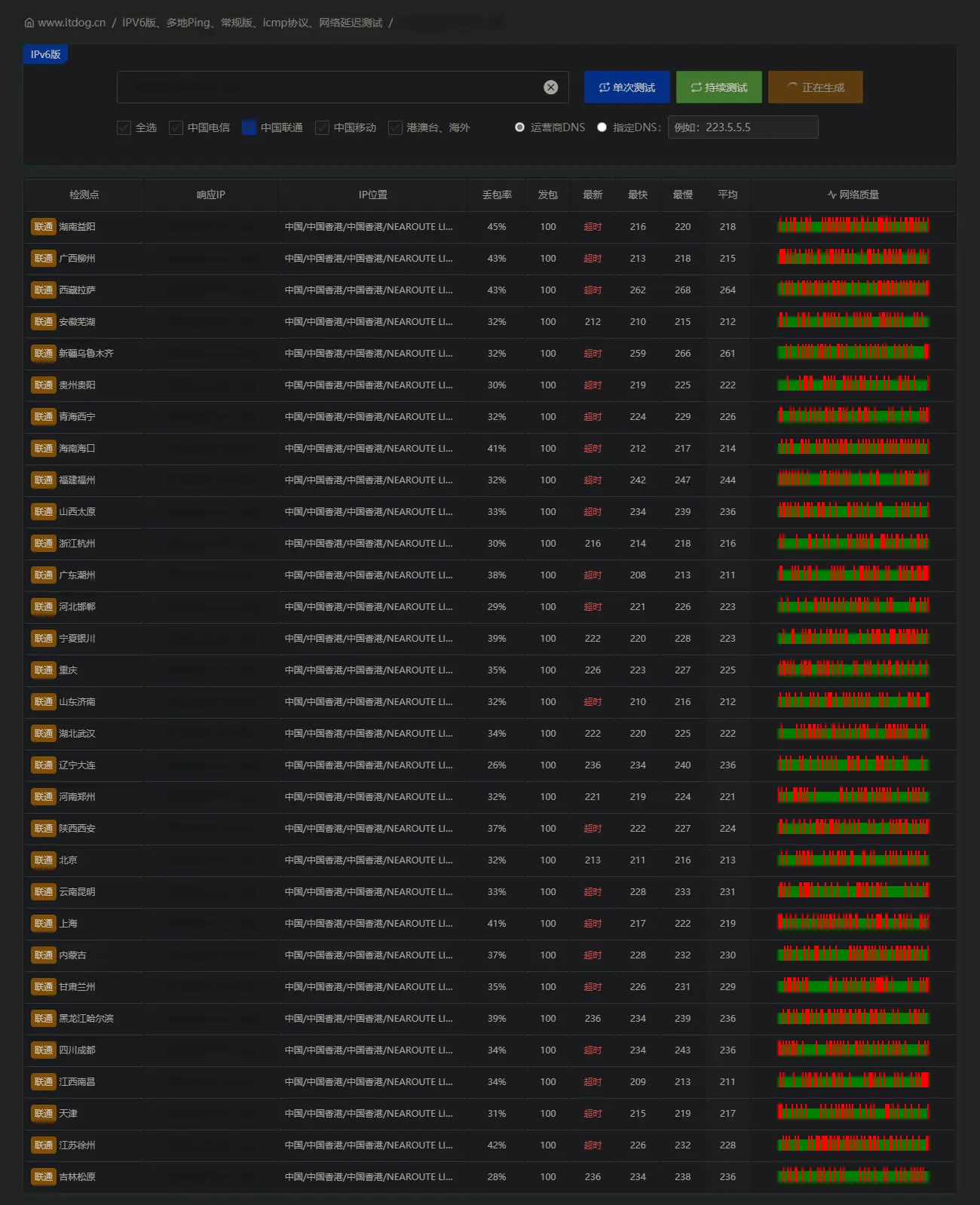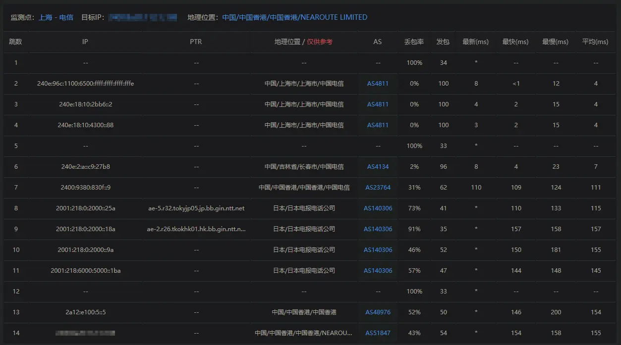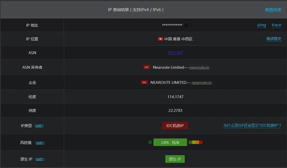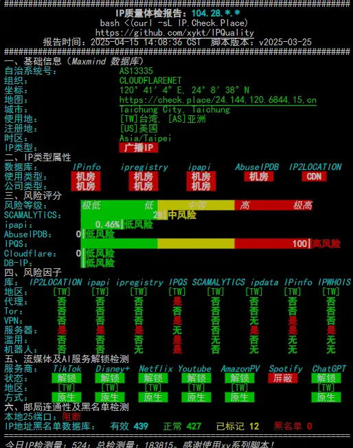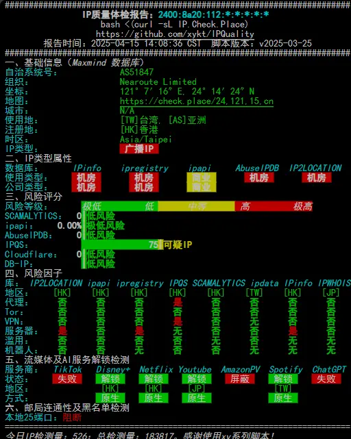 --------------------------------------IP质量检测-------------------------------------- 以下为各数据库编号,输出结果后将自带数据库来源对应的编号 ipinfo数据库 [0] | scamalytics数据库 [1] | virustotal数据库 [2] | abuseipdb数据库 [3] | ip2location数据库 [4] ip-api数据库 [5] | ipwhois数据库 [6] | ipregistry数据库 [7] | ipdata数据库 [8] | db-ip数据库 [9] ipapiis数据库 [A] | ipapicom数据库 [B] | bigdatacloud数据库 [C] | cheervision数据库 [D] | ipqualityscore数据库 [E] IPV4: 安全得分: 声誉(越高越好): 0 [2] 信任得分(越高越好): 100 [8] VPN得分(越低越好): 0 [8] 代理得分(越低越好): 0 [8] 社区投票-无害: 0 [2] 社区投票-恶意: 0 [2] 威胁得分(越低越好): 0 [8] 欺诈得分(越低越好): 28 [1] 99 [E] 滥用得分(越低越好): 0 [3] ASN滥用得分(越低越好): 0.0023 (Low) [A] 公司滥用得分(越低越好): 0.0046 (Low) [A] 威胁级别: low [9] 黑名单记录统计:(有多少黑名单网站有记录): 无害记录数: 0 [2] 恶意记录数: 0 [2] 可疑记录数: 0 [2] 无记录数: 94 [2] 安全信息: 使用类型: DataCenter/WebHosting/Transit [3] hosting [0 7 8 9 A] unknown [C] 公司类型: hosting [0 7 A] 是否云提供商: Yes [7 D] 是否数据中心: Yes [0 1 6 8 A] No [5 C] 是否移动设备: Yes [E] No [5 A C] 是否代理: Yes [5 E] No [0 1 4 6 7 8 9 A C D] 是否VPN: No [1 6 7 A C D] Yes [0 E] 是否TorExit: No [1 7 D] 是否Tor出口: No [1 7 D] 是否网络爬虫: No [9 A E] 是否匿名: No [1 6 7 8 D] 是否攻击者: No [7 8 D] 是否滥用者: Yes [E] No [7 8 A C D] 是否威胁: No [7 8 C D] 是否中继: No [0 7 8 C D] 是否Bogon: No [7 8 A C D] 是否机器人: Yes [E] DNS-黑名单: 313(Total_Check) 0(Clean) 7(Blacklisted) 25(Other) IPV6: 安全得分: 欺诈得分(越低越好): 0 [1] 滥用得分(越低越好): 0 [3] ASN滥用得分(越低越好): 0.0011 (Low) [A] 公司滥用得分(越低越好): 0 (Very Low) [A] 安全信息: 使用类型: business [A] DataCenter/WebHosting/Transit [3] 公司类型: business [A] 是否云提供商: Yes [D] 是否数据中心: Yes [1] No [A] 是否移动设备: No [A] 是否代理: No [1 A D] 是否VPN: No [1 A D] 是否Tor: No [1 3 A D] 是否Tor出口: No [1 D] 是否网络爬虫: No [A] 是否匿名: No [1 D] 是否攻击者: No [D] 是否滥用者: No [A D] 是否威胁: No [D] 是否中继: No [D] 是否Bogon: No [A D] DNS-黑名单: 313(Total_Check) 0(Clean) 0(Blacklisted) 313(Other) -------------------------------------三网回程线路检测------------------------------------- 北京电信v4 219.141.140.10 检测不到回程路由节点的IPV4地址 北京联通v4 202.106.195.68 联通4837 [普通线路] 北京移动v4 221.179.155.161 移动CMI [普通线路] 上海电信v4 202.96.209.133 电信163 [普通线路] 上海联通v4 210.22.97.1 联通4837 [普通线路] 上海移动v4 211.136.112.200 移动CMI [普通线路] 广州电信v4 58.60.188.222 电信163 [普通线路] 广州联通v4 210.21.196.6 联通4837 [普通线路] 广州移动v4 120.196.165.24 移动CMI [普通线路] 成都电信v4 61.139.2.69 电信163 [普通线路] 成都联通v4 119.6.6.6 联通4837 [普通线路] 成都移动v4 211.137.96.205 移动CMI [普通线路] 北京电信v6 2400:89c0:1053:3::69 电信163 [普通线路] 北京联通v6 2400:89c0:1013:3::54 联通4837 [普通线路] 北京移动v6 2409:8c00:8421:1303::55 移动CMIN2 [精品线路] 移动CMI [普通线路] 上海电信v6 240e:e1:aa00:4000::24 电信163 [普通线路] 上海联通v6 2408:80f1:21:5003::a 联通4837 [普通线路] 上海移动v6 2409:8c1e:75b0:3003::26 移动CMI [普通线路] 广州电信v6 240e:97c:2f:3000::44 电信163 [普通线路] 广州联通v6 2408:8756:f50:1001::c 联通4837 [普通线路] 广州移动v6 2409:8c54:871:1001::12 移动CMIN2 [精品线路] -------------------------------------三网回程路由检测------------------------------------- 广州电信 - ICMP v4 - traceroute to 58.60.188.222, 30 hops max, 52 byte packets 2.78 ms AS13335 [CLOUDFLARENET] 美国, 佐治亚州, 亚特兰大, cloudflare.com 1.42 ms AS13335 [CLOUDFLARENET] 巴西, 里约热内卢州, 里约热内卢, cloudflare.com 2.54 ms AS13335 [CLOUDFLARE-AP] 中国, 香港, cloudflare.com 2.21 ms AS1299 [ARELION-NET] 中国, 香港, arelion.com 3.22 ms AS1299 [ARELION-NET] 中国, 香港, arelion.com 55.60 ms AS1299 [ARELION-NET] 日本, 东京都, 东京, arelion.com 148.42 ms AS1299 [ARELION-NET] 美国, 加利福尼亚, 洛杉矶, arelion.com 160.28 ms AS1299 [ARELION-NET] 美国, 加利福尼亚, 洛杉矶, arelion.com 149.00 ms AS1299 [ARELION-NET] 美国, 加利福尼亚, 洛杉矶, arelion.com * 305.51 ms AS4134 [CHINANET-BB] 中国, 广东, 广州, www.chinatelecom.com.cn 电信 316.04 ms AS4134 [CHINANET-BB] 中国, 广东, 广州, www.chinatelecom.com.cn 电信 * * 311.47 ms AS4134 中国, 广东, 深圳, www.chinatelecom.com.cn 电信 广州联通 - ICMP v4 - traceroute to 210.21.196.6, 30 hops max, 52 byte packets 2.41 ms AS13335 [CLOUDFLARENET] 美国, 佐治亚州, 亚特兰大, cloudflare.com 1.34 ms AS13335 [CLOUDFLARENET] 巴西, 里约热内卢州, 里约热内卢, cloudflare.com 2.42 ms AS13335 [CLOUDFLARE-AP] 中国, 香港, cloudflare.com 2.04 ms AS1299 [TELIANET] 中国, 香港, arelion.com 2.49 ms AS1299 [ARELION-NET] 中国, 香港, arelion.com 50.79 ms AS1299 [ARELION-NET] 日本, 东京都, 东京, arelion.com 148.12 ms AS1299 [ARELION-NET] 美国, 加利福尼亚, 洛杉矶, arelion.com * 322.61 ms AS1299 美国, 加利福尼亚, 洛杉矶, arelion.com 329.54 ms AS4837 [CU169-BACKBONE] 中国, 北京, chinaunicom.cn 联通 328.26 ms AS4837 [CU169-BACKBONE] 中国, 北京, chinaunicom.cn 联通 363.31 ms AS4837 [CU169-BACKBONE] 中国, 北京, chinaunicom.cn 联通 * 326.09 ms AS17816 [UNICOM-GD] 中国, 广东, 深圳, chinaunicom.cn 联通 328.05 ms AS17623 [APNIC-AP] 中国, 广东, 深圳, chinaunicom.cn 联通 317.46 ms AS17623 中